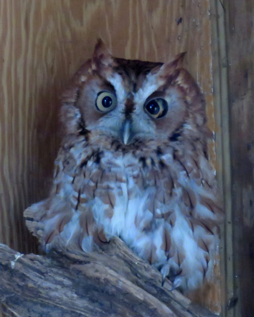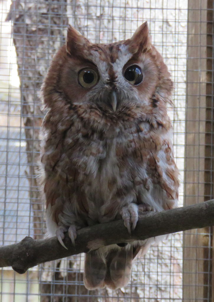 Otus is an Eastern Screech Owl (Megascops asio).  We are pretty sure Otus was hit by a car, as she was found on the side of the road.  Otus joined our education birds in 2009.  She has lost her right eye, and has a non-repairable right wing injury, so is unable to fly.